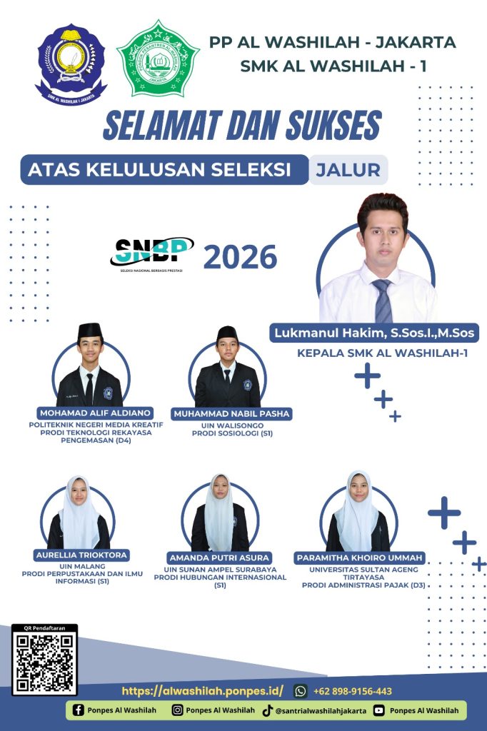 JAKARTA – SMKS Al Washilah 1 Jakarta kembali menorehkan prestasi membanggakan dalam Seleksi Nasional Berdasarkan Prestasi (SNBP) 2026. Sebanyak lima siswa-siswi berhasil lolos ke berbagai perguruan tinggi negeri (PTN), menunjukkan daya saing lulusan SMK di tingkat nasional.